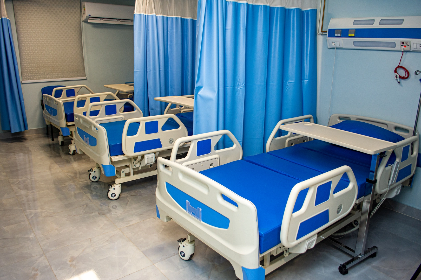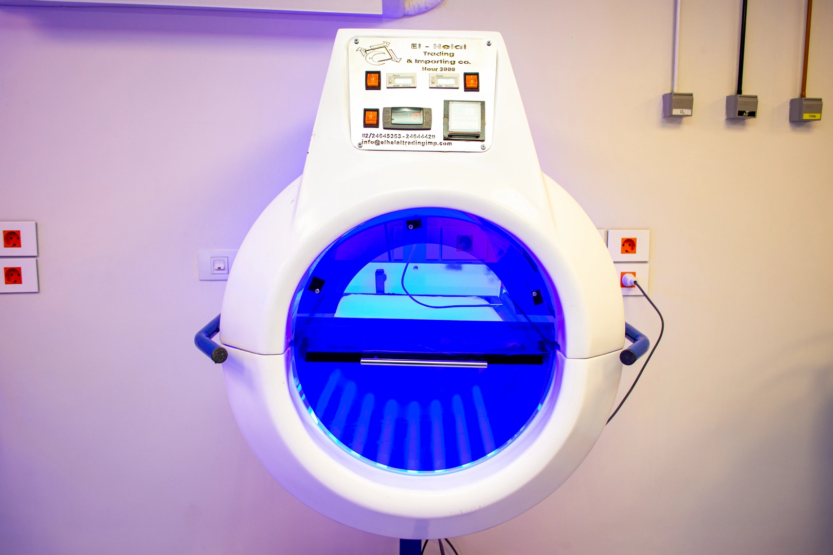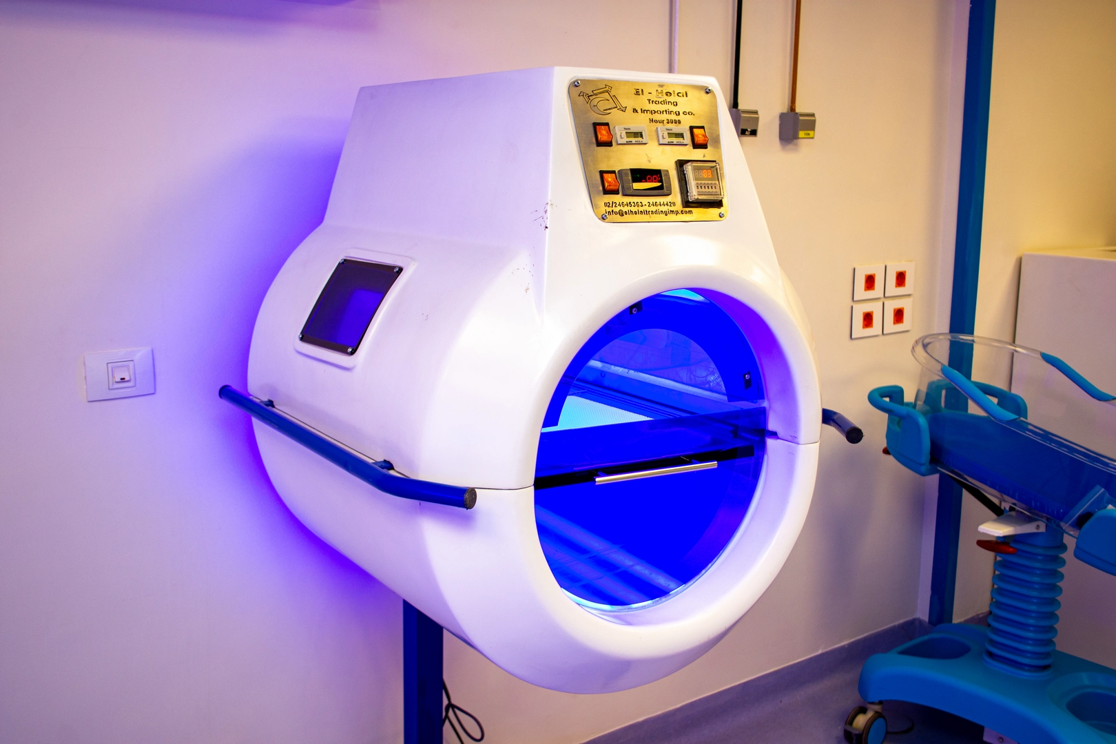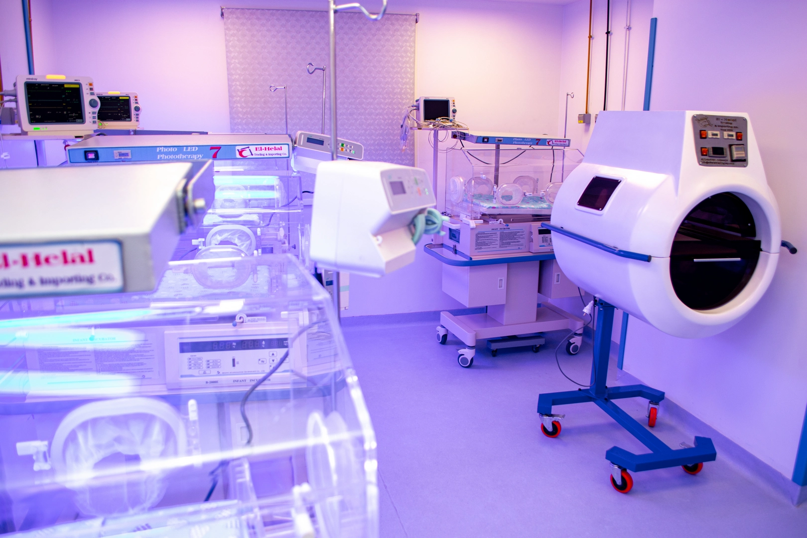 A photograph of AlMOMAIZ Hospital, Egypt’s leading hospital, a sprawling complex featuring extensive facilities across multiple floors, including a large number of rooms, modern operating theatres, neonatal incubators, a comprehensive diagnostic laboratory, and advanced radiology services.
