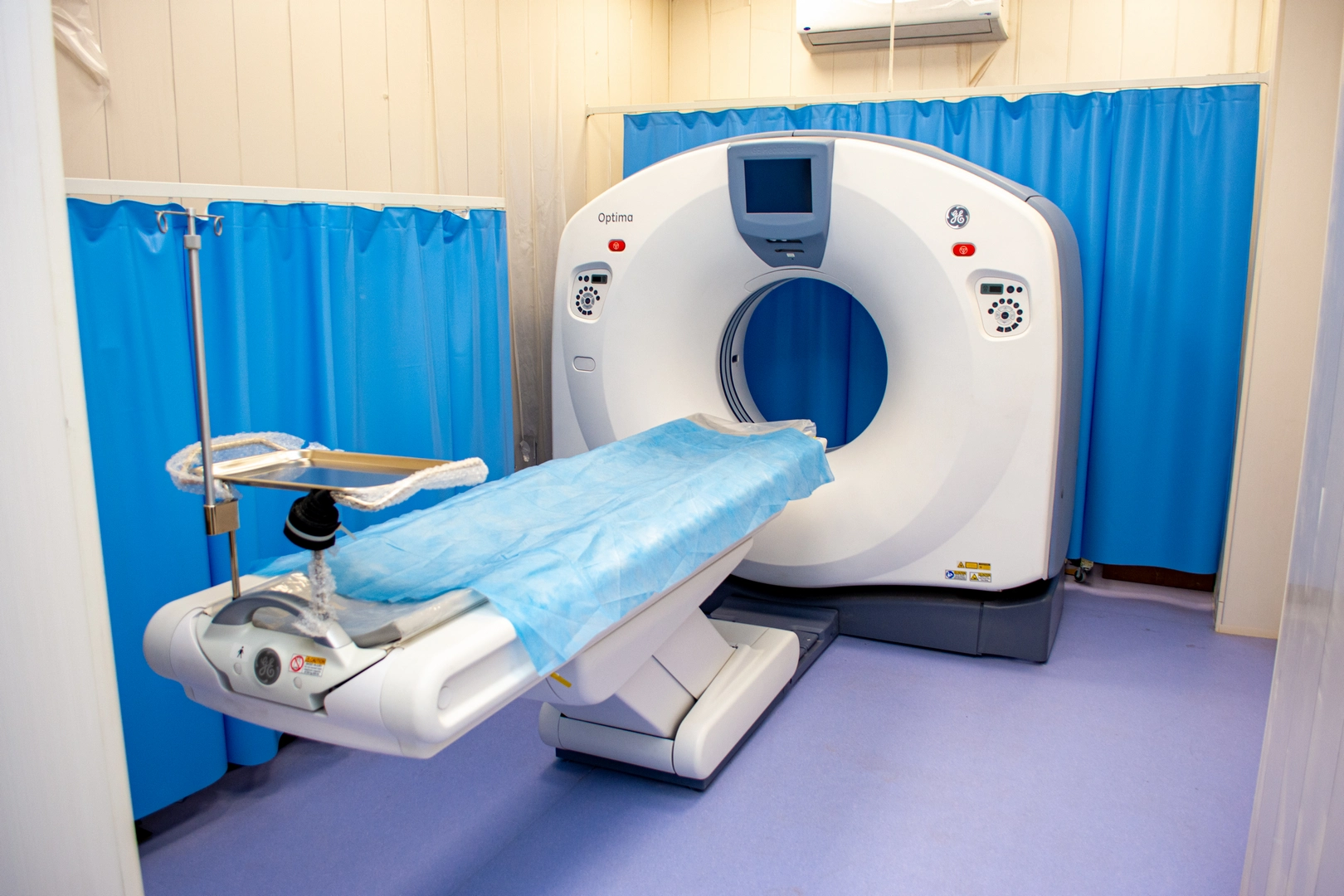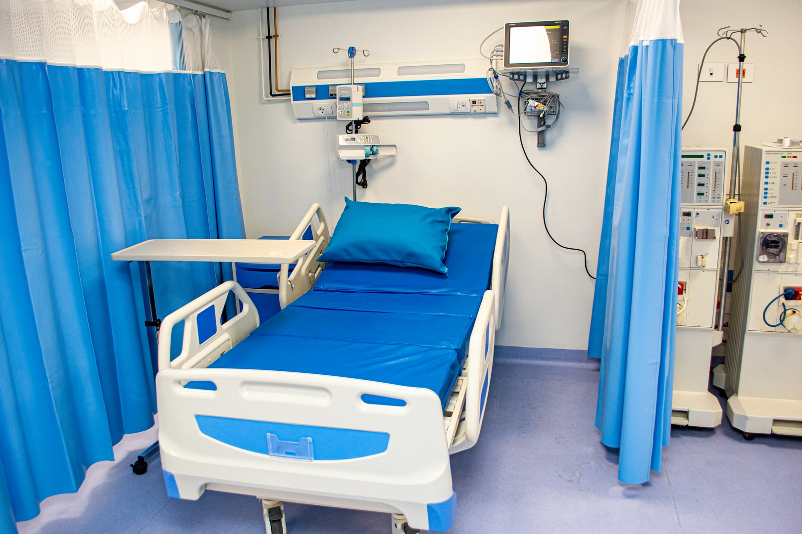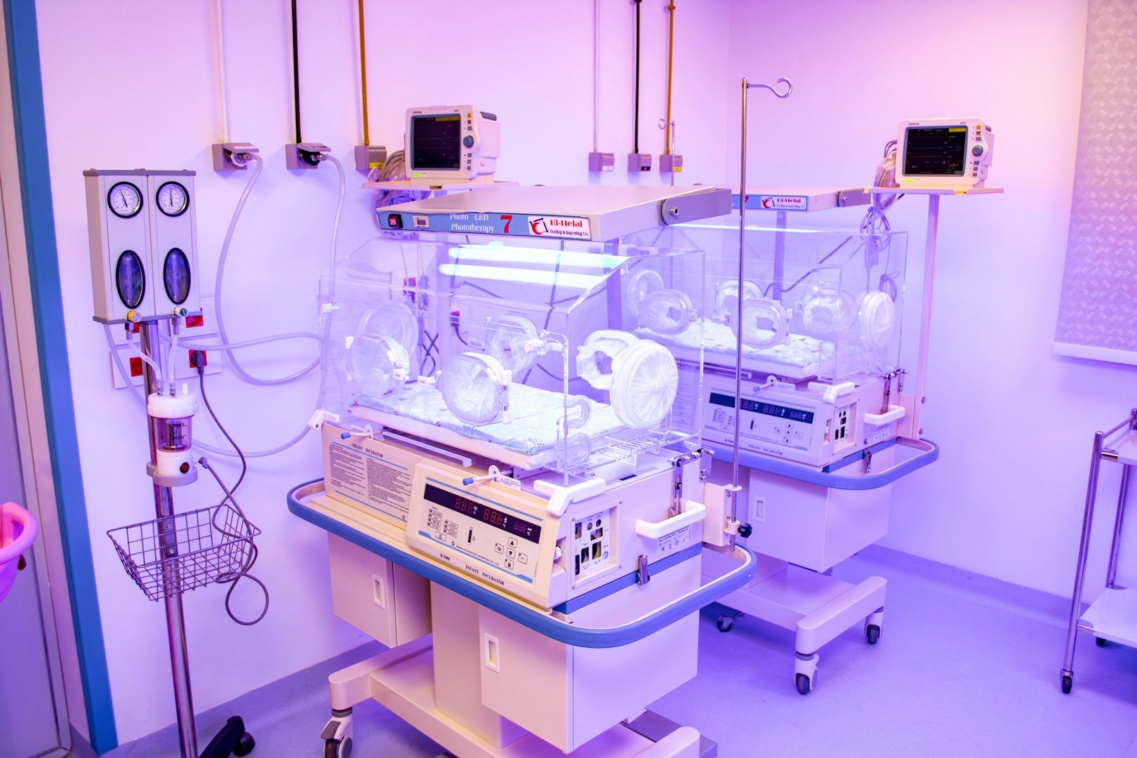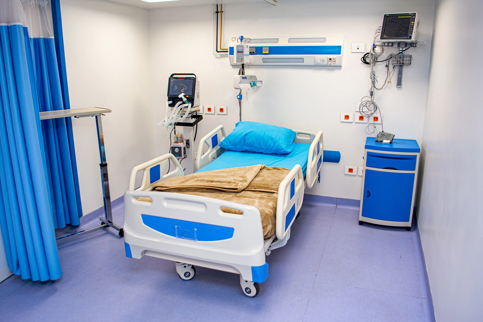 A photograph of AlMOMAIZ Hospital, Egypt’s leading hospital, a sprawling complex featuring extensive facilities across multiple floors, including a large number of rooms, modern operating theatres, neonatal incubators, a comprehensive diagnostic laboratory, and advanced radiology services.